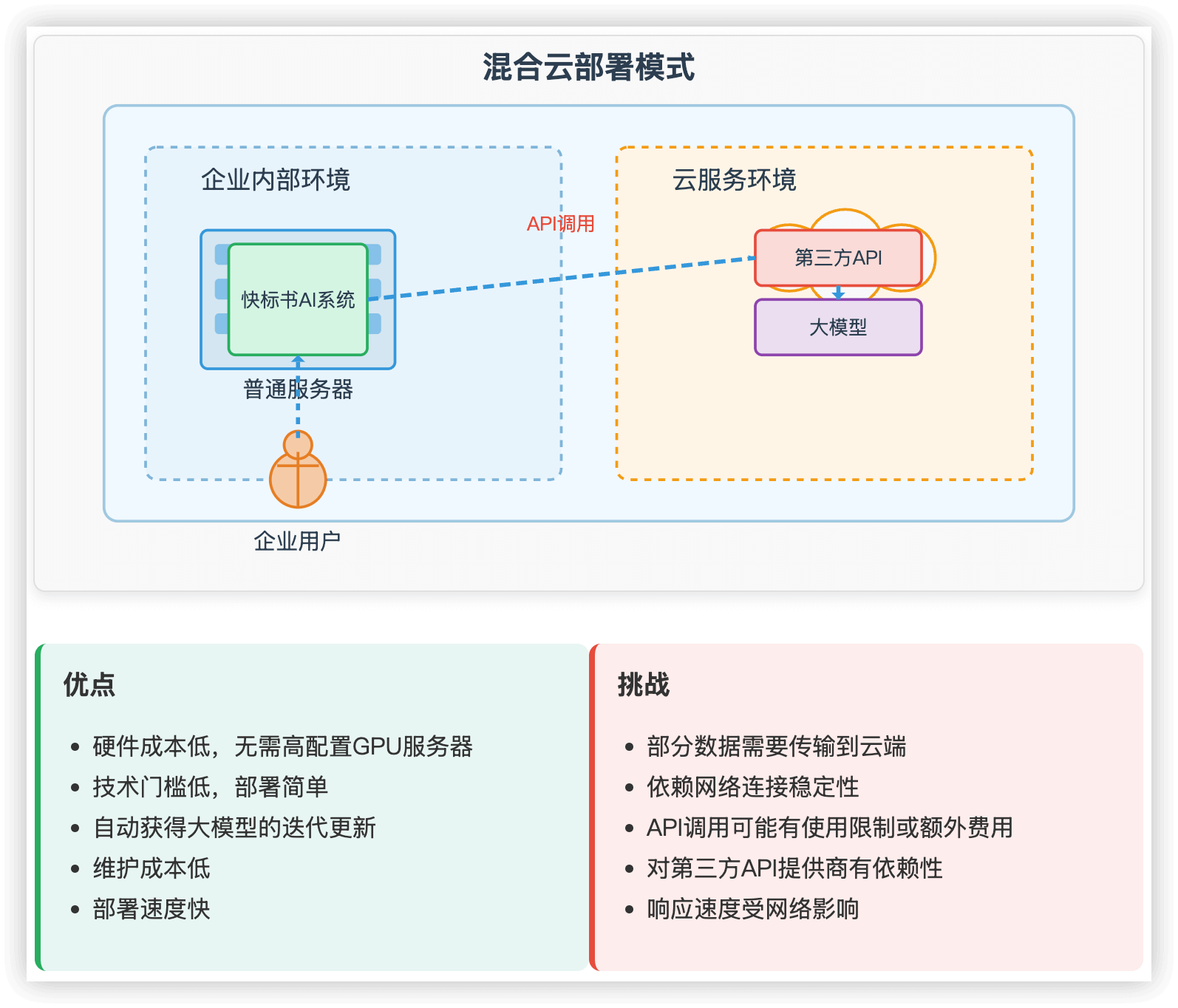 混合云部署的优点在于成本效益高,企业无需购买和维护高配置的服务器,只需支付第三方API的使用费用。此外,由于大模型由专业团队进行维护和更新,企业可以始终保持技术的先进性。然而,选择可靠的第三方API提供商至关重要,企业需要确保数据的安全性和服务的稳定性。